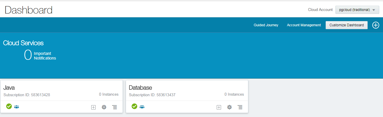 Once the DB Cloud Instance and JCS Instances are created, dashboard looks as follows. You can see that the instances count are one for both of them.